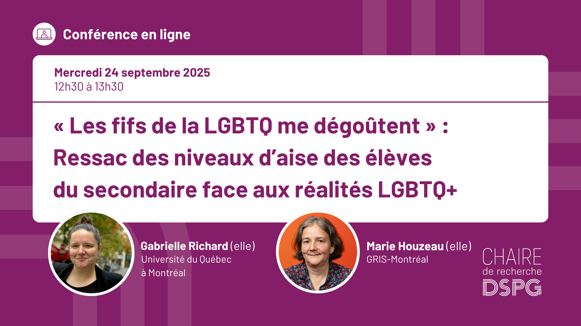 Résumé : Au Québec comme ailleurs, des faits d’actualité récente ont contribué à positionner les personnes LGBTQ+ comme étant des sujets de société sur lesquels une diversité d’opinions serait valide. La sphère scolaire est évidemment perméable à ces discours. Les données colligées dans des classes de secondaire par le GRIS-Montréal à travers plusieurs années montrent un déclin significatif des niveaux d’aise auto-rapportés de ces élèves face à la diversité sexuelle et la pluralité des genres. Cette conférence midi propose un retour sur ces principaux constats, ainsi que des hypothèses expliquant l’existence de ce ressac.