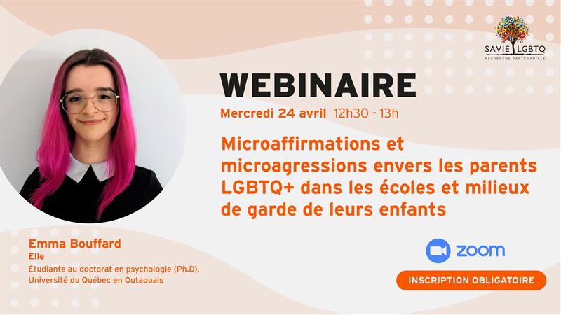 Les milieux scolaires et services de garde sont des lieux où plusieurs familles LGBTQ+ sont confrontées à des commentaires ou questions dérangeantes, qu’on appelle des microagressions. D’autres sont également accueillies par des microaffirmations, comme des gestes de compassion et de bienveillance. Ce webinaire présente ces expériences vécues par 428 parents LGBTQ+ interrogé·es lors de l’enquête SAVIE-LGBTQ, ainsi que les stratégies utilisées pour prévenir ces situations négatives. Les résultats révèlent que trois quarts des familles vivent des expériences affirmatives. Toutefois, les microagressions sont aussi répandues et touchent près de deux parents sur trois. Les personnes interrogées sont nombreuses à adopter des stratégies visant à éviter de telles expériences négatives. Cette présentation met en évidence les caractéristiques des parents plus susceptibles de rapporter des microaffirmations ou microagressions.
