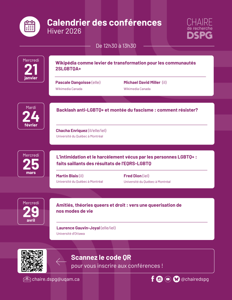 La Chaire de recherche sur la diversité sexuelle et la pluralité des genres est fière de dévoiler la programmation des conférences de l’hiver 2026.