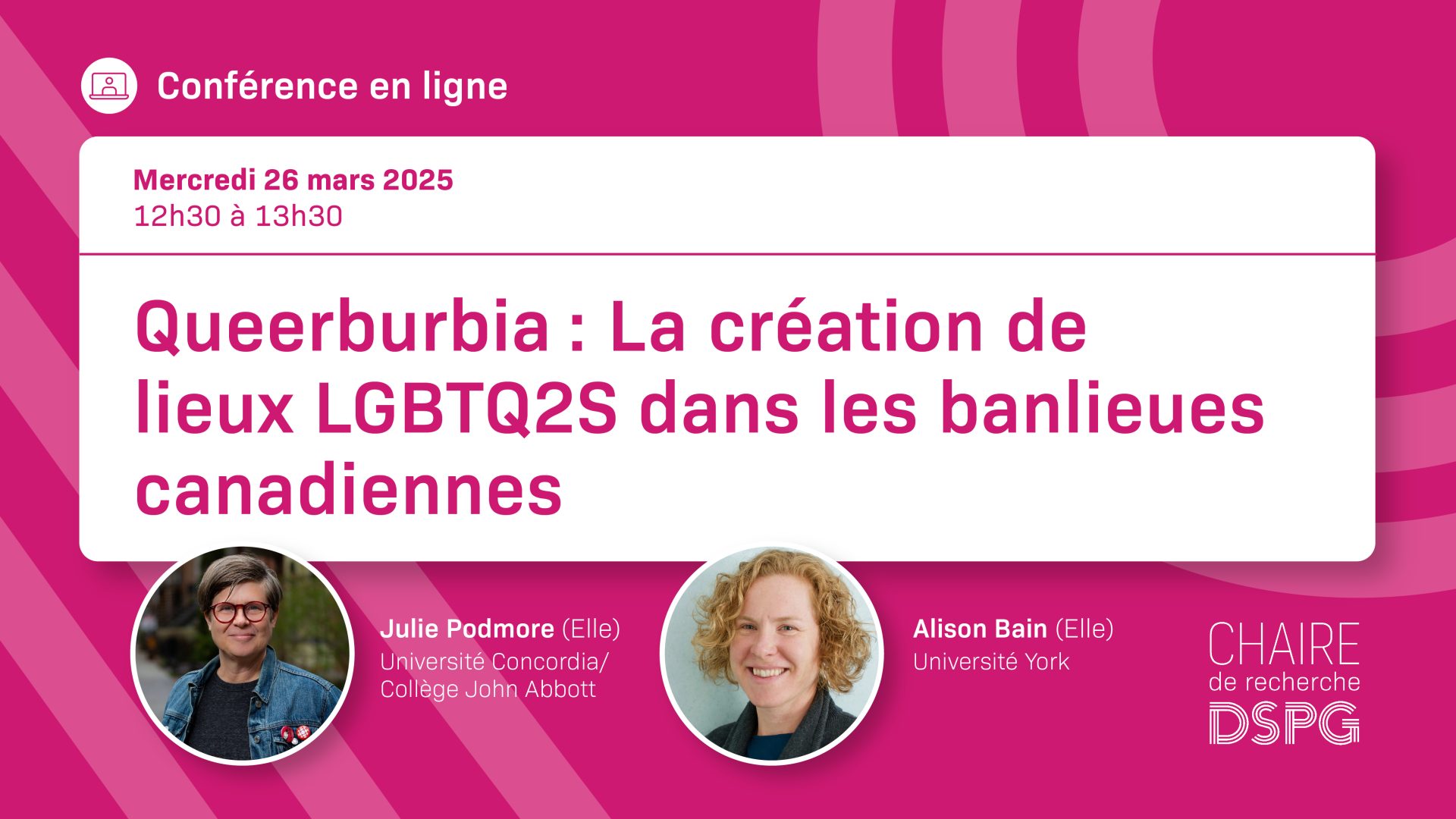 Résumé de la conférence : Le concept de « queerburbia » est un néologisme contestataire des métronormativités queers, mettant en lumière la périphérie métropolitaine et les vies LGBTQ2S moins visibles. Il transforme la réputation hétéronormative de la banlieue nord-américaine et enrichit les études suburbaines en intégrant la création de lieux queers. S’appuyant sur une étude de sept ans portant sur des municipalités suburbaines canadiennes, le concept de « queerburbia » mobilise le « placemaking » comme cadre analytique pour comprendre comment représentations médiatiques et statistiques, politiques d’inclusion municipales et parapubliques, et militantisme LGBTQ2S fabriquent, défont et refaçonnent les banlieues canadiennes en tant que nouveaux espaces queers.