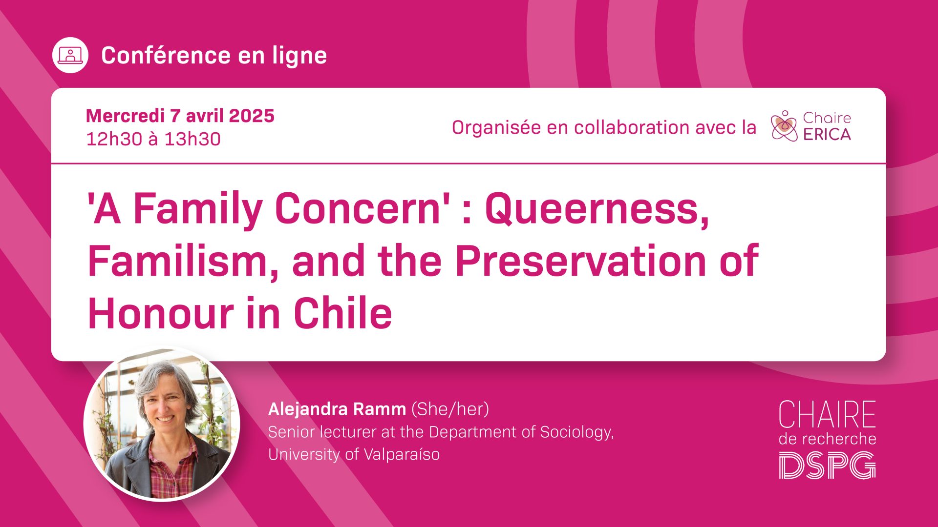 Conférencière : Alejandra Ramm (she/her) has a PhD in sociology from Cambridge University, UK, and is a senior lecturer at the Department of Sociology, University of Valparaíso. She studies gender and public policy; kinship and families; same-sex couples; and abortion. She has just published an article on family honour and LGBT+ people in Chile in Culture, Health & Sexuality (2024). Together with Jasmine Gideon, she edited the book Motherhood, Social Policies and Women’s Activism in Latin America (Palgrave Macmillan, 2020). She has also published on abortion in Social Science and Medicine (2020). She is currently directing a Fondecyt Regular project (#1211012) on public and private struggles of same-sex couples in Chile and a Anillo project, ‘Decentering Gender Inequalities’ (ATE220051).