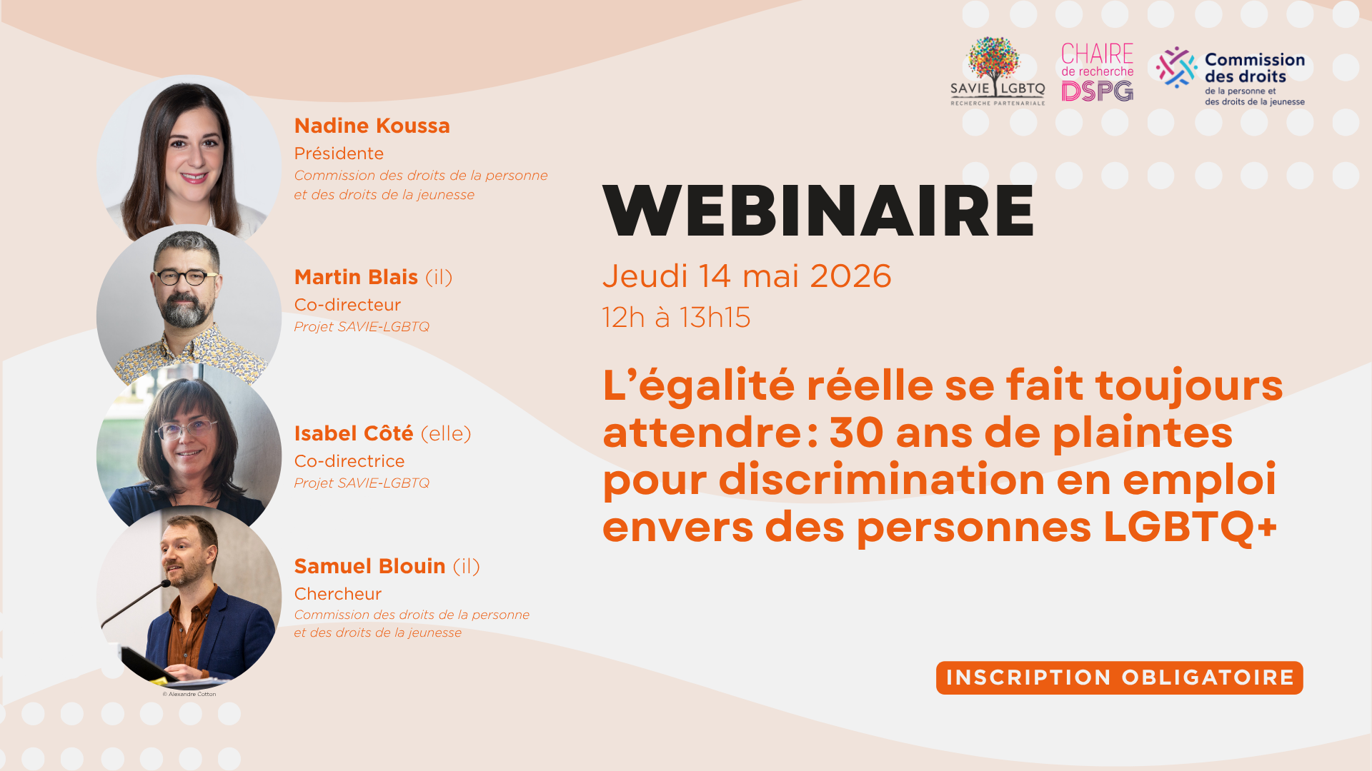 Ce webinaire est coprésenté par la Commission des droits de la personne et des droits de la jeunesse et le projet de recherche partenariale SAVIE-LGBTQ de la Chaire de recherche sur la diversité sexuelle et la pluralité des genres. Il aura lieu le jeudi 14 mai 2026, de 12h à 13h15.